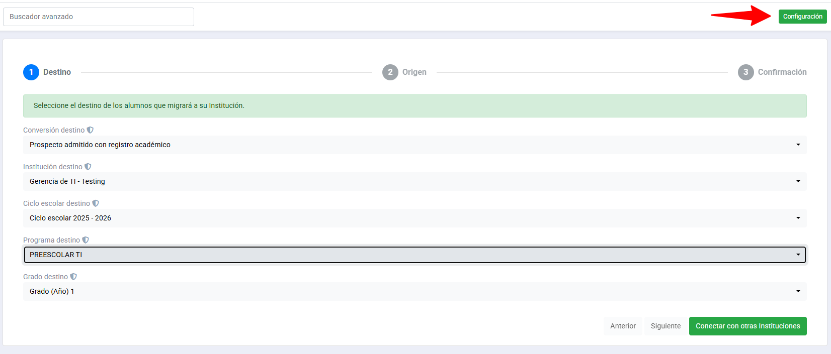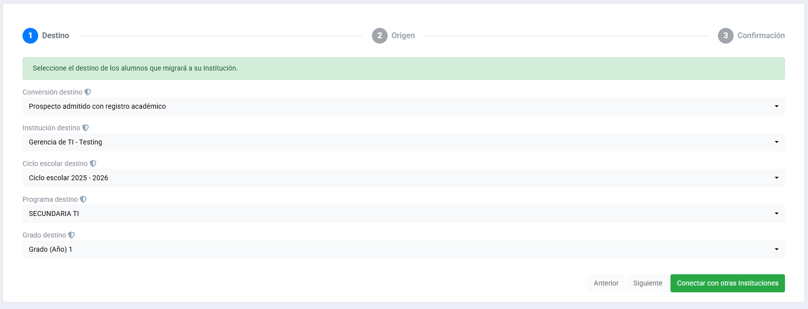 Tu función: Debes confirmar con el área de promoción del colegio de origen que hayan agregado a tu institución a la lista de "colegios permitidos para consultar información". Sin este paso, el sistema no te permitirá visualizar ni atraer los datos del alumno.