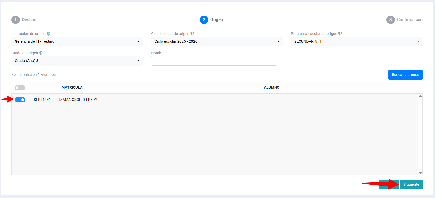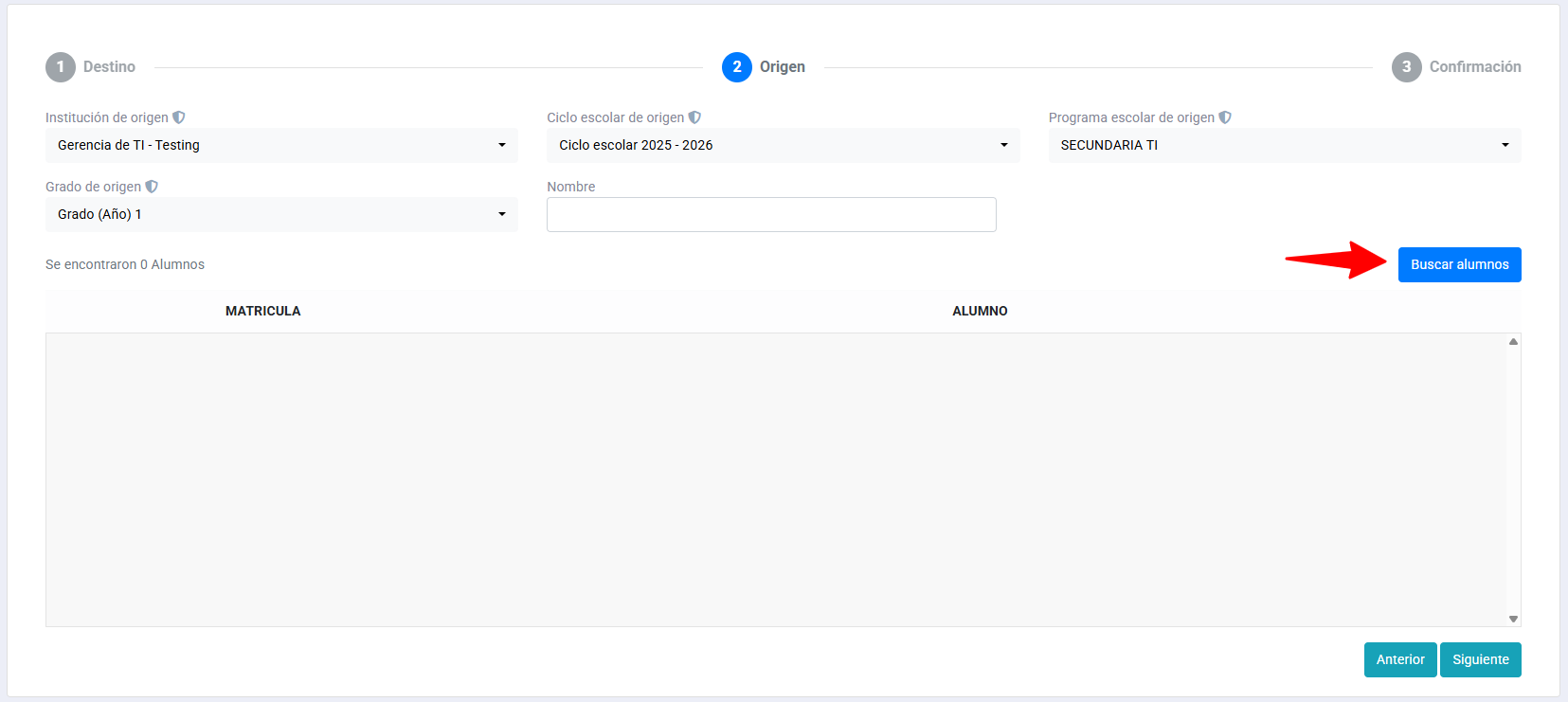 El sistema no arroja resultados al buscar al alumno en el "Paso 2: Origen".