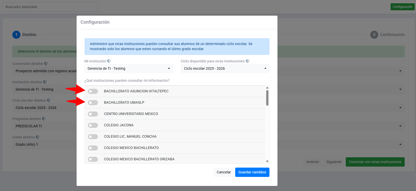 Seleccionar las instituciones externas a las que se les dará permiso para consultar la información de tus alumnos. Y de clic en Guardar cambios